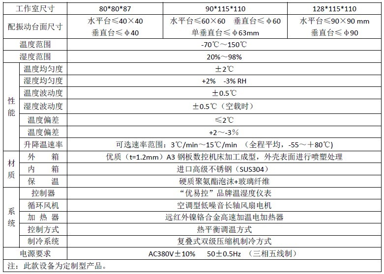温湿度振动三综合试验机主体部分:主体外壳采用优质A3钢板并且经过喷塑处理,内胆采用SUS高级不锈钢镜面板保温介质为超细玻璃棉;